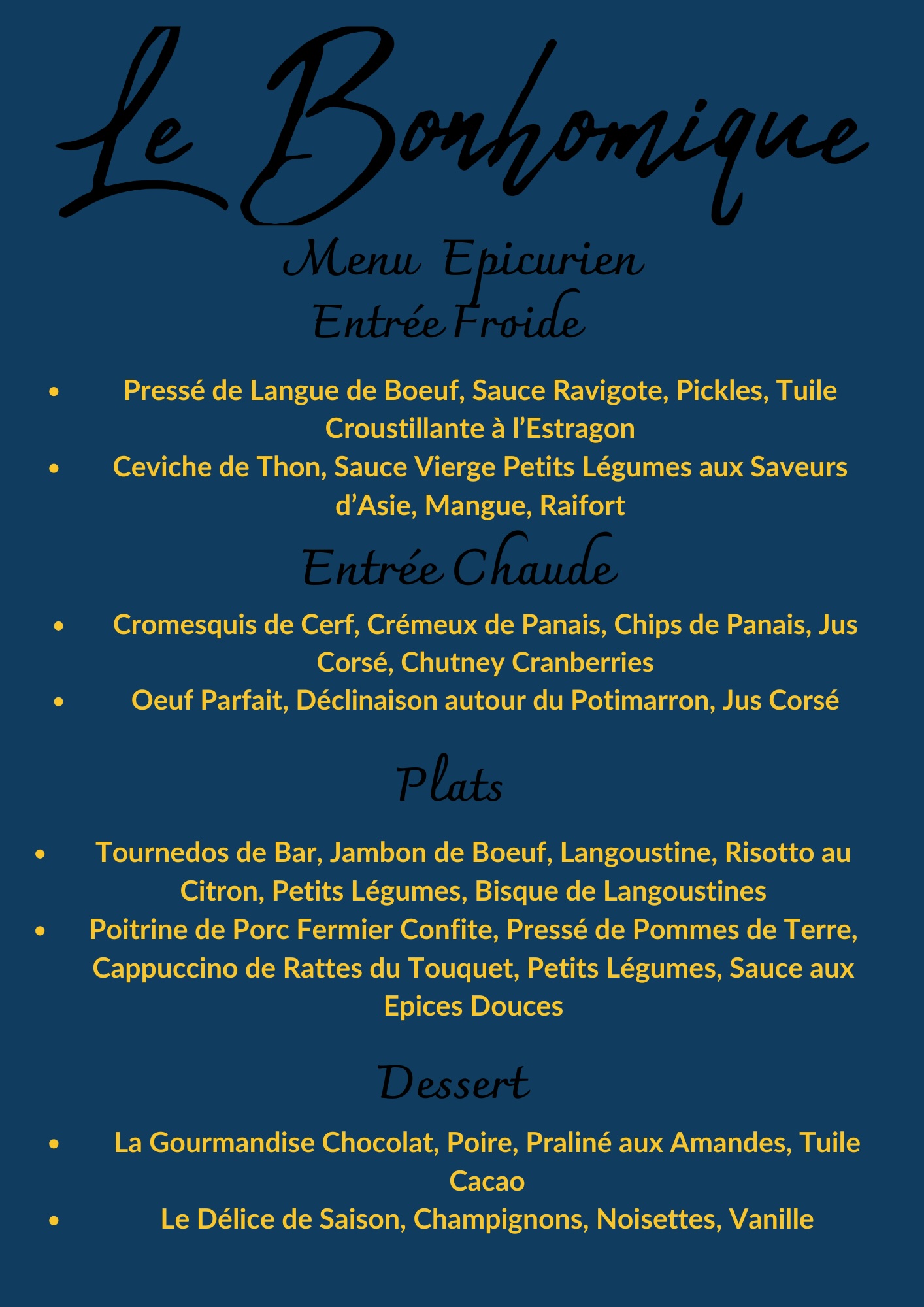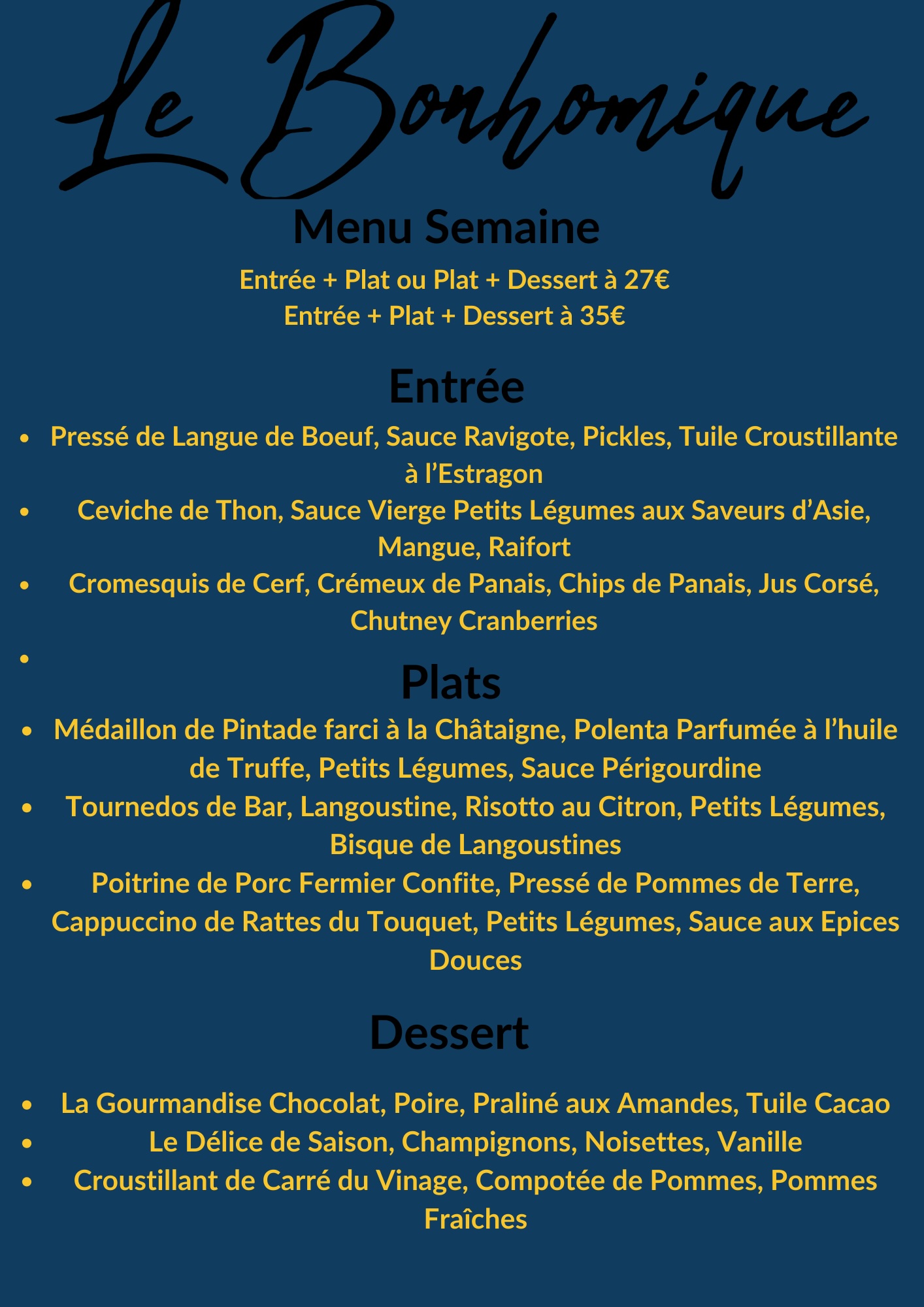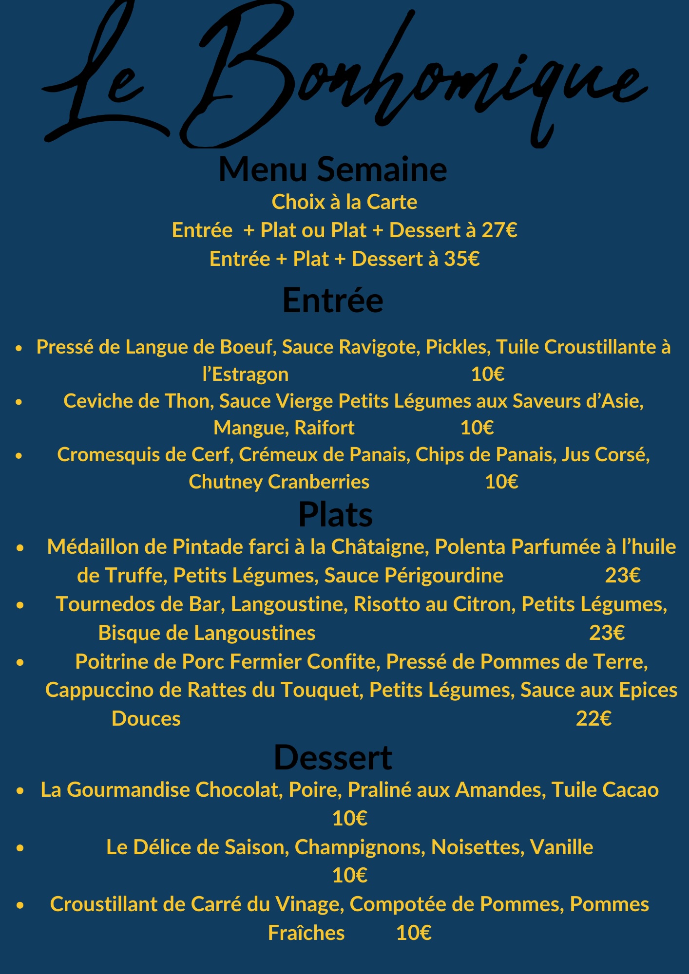 Menu pour les soirées du vendredi et samedi. Menu en 3 temps : Entrée au choix + Plat + Dessert Ce menu est présenté chaque vendredi matin.