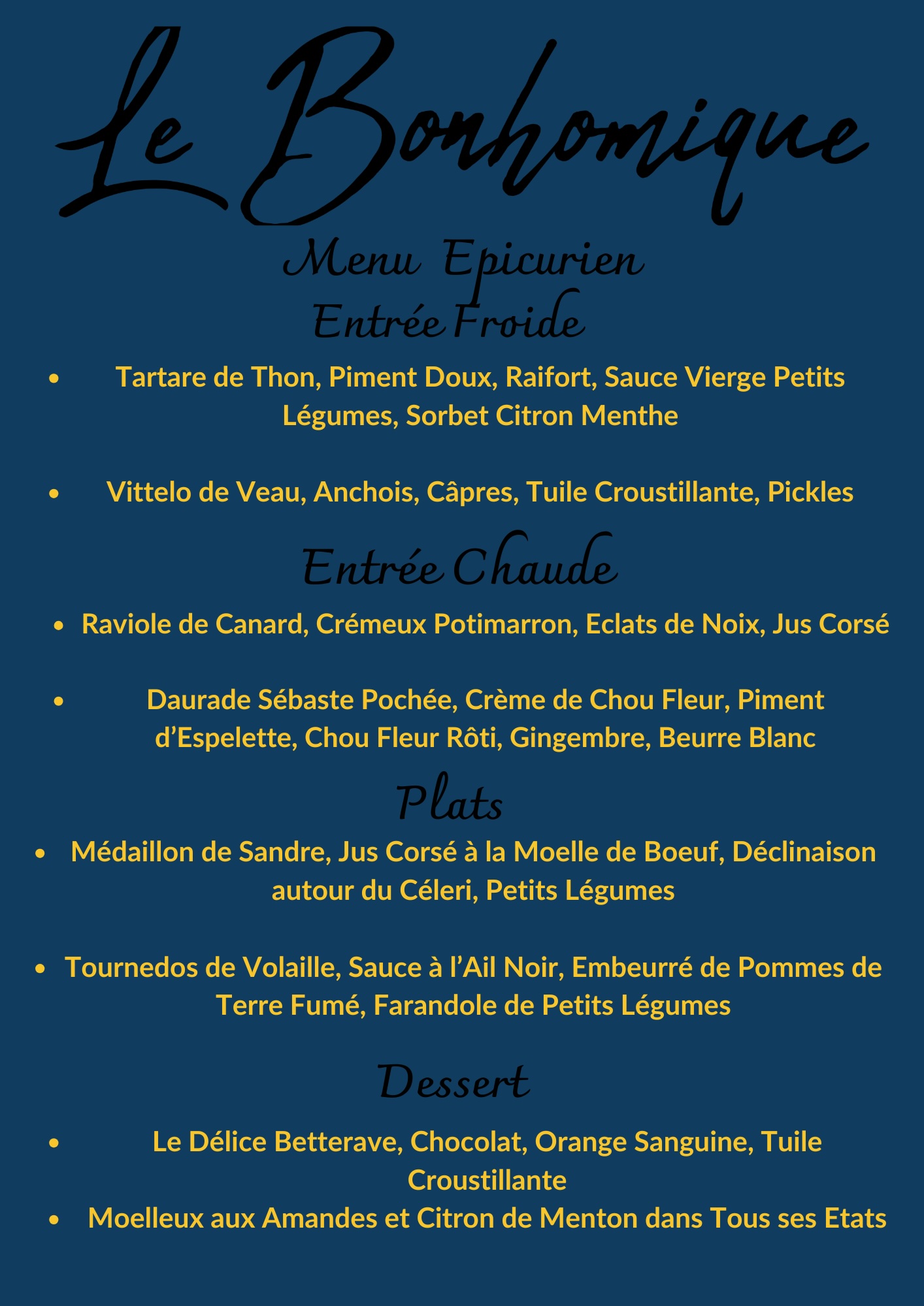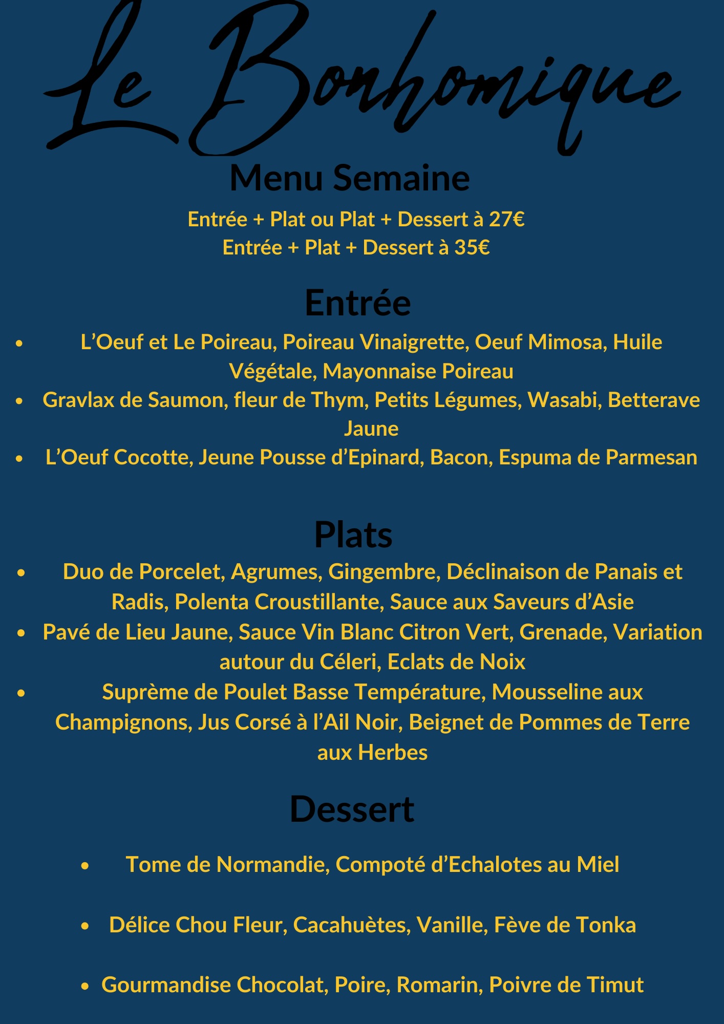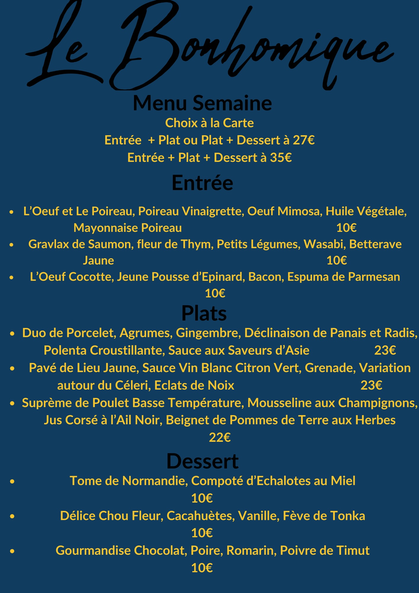 Menu pour les soirées du vendredi et samedi. Menu en 3 temps : Entrée au choix + Plat + Dessert Ce menu est présenté chaque vendredi matin.